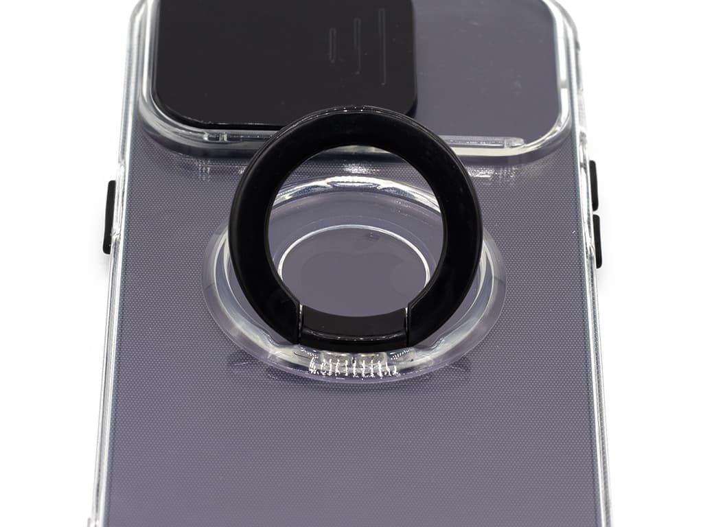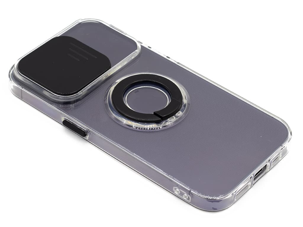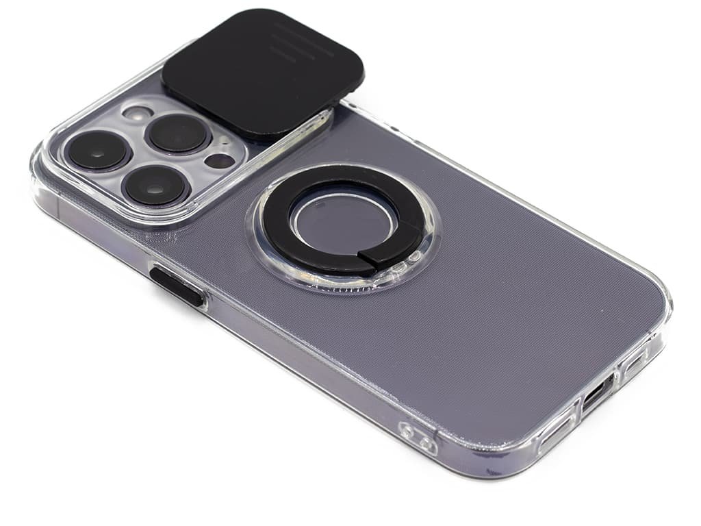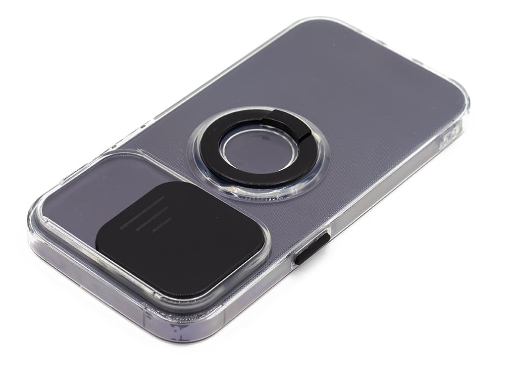 Průhledný obal s krytkou fotoaparátu na iPhone 14 Pro Max s prstýnkem pro snazší držení. Ochranný kryt je ideální variantou, jak ochránit váš telefon před všemi způsoby poškození.