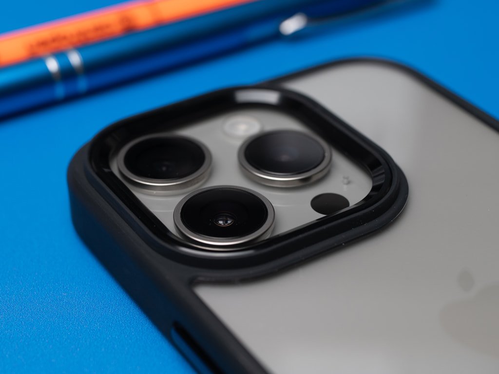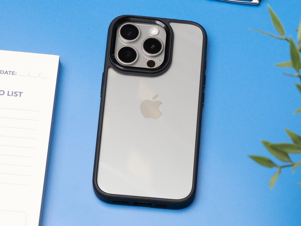 Vysoce odolný obal na iPhone 15 Pro v průhledném zpracování. Vyztužený, černý rámeček po stranách. Jeden z nejodolnějších obalů.